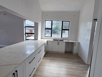 This stylish home features an open-plan kitchen with a 5-plate gas stove and oven, flowing into a spacious lounge and dining area. A scullery and laundry room are located just off the kitchen. The property offers three bedrooms — the master has glass doors leading onto the verandah and a full en-suite bathroom— plus a family bathroom and guest toilet. All bedrooms have built-in cupboards and have plenty natural light. Attached to the townhouse is a self-contained room which can be used as a guest room or as a staff quarter.