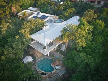 A formal lounge boasts a large fireplace and leads onto a covered veranda complete with an outdoor kitchen. The grand dining area, seating up to 16, is also equipped with a fireplace and french doors to the veranda. A well fitted very spacious kitchen is the ideal space to call the heart of the home. The house and surrounds are an entertainers delight with verandas, star gazing spaces, a firepit and a braai area. A functional swimming pool and gazebo nestle in the picturesque, waterwise garden. Take in the beauty of the home whilst enjoying panoramic views of the Hillside Dams.