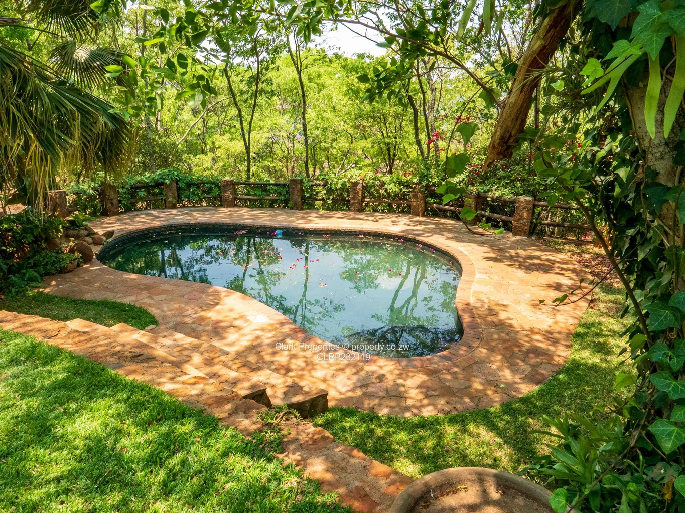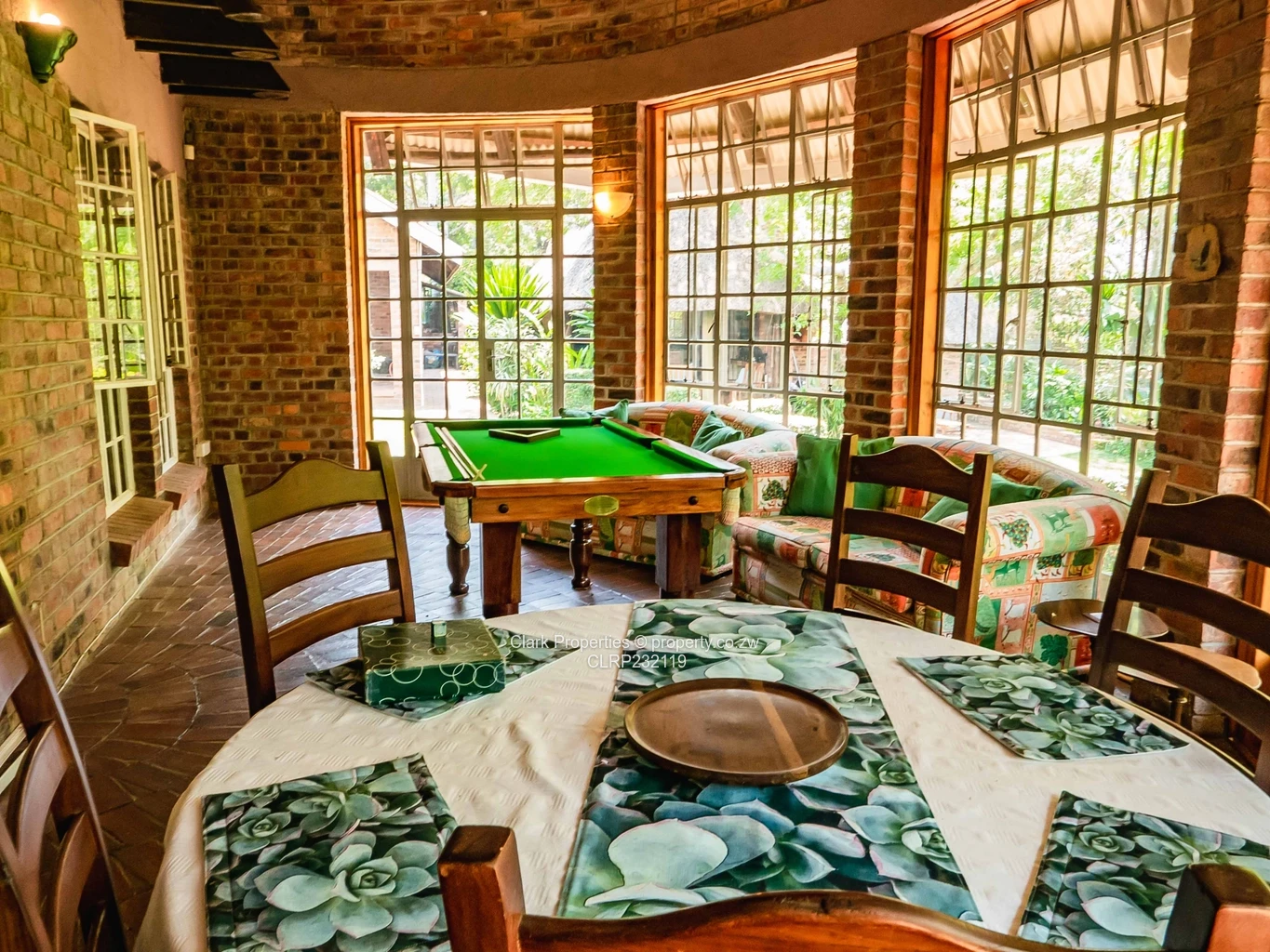 The outdoor amenities make entertaining a pleasure, featuring a thatched entertainment area with a bar and fireplace overlooking the lush green lawn and swimming pool. Adjacent is a separate one-bedroom suite with a bathroom, ideal for guests.