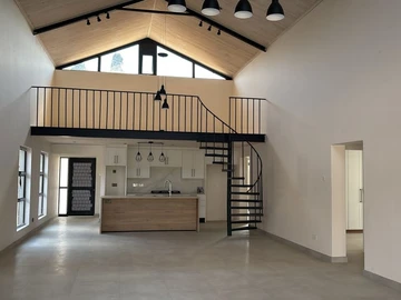 There is a guest toilet and a spiral staircase, which takes you to a mezzanine floor, an ideal space for an office or second lounge.